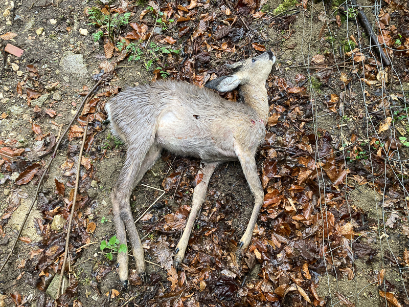 Az első őzeket a nyiladékban pillantottam meg. Suta surrant át jobbról balra. Teljesen váratlanul ért, de utána kb. 10 másodperccel követte a tavalyi gidája, egy gyenge bak. Pont ilyenre fentem a fogam, de lövésre gondolni sem tudtam, olyan gyorsan játszódott le a szituáció. Ennek ellenére bíztam benne, hogy itt további őzek fogják keresztezni a nyílást, úgyhogy letettem a távcsövet, és a fegyver céltávcsövén keresztül figyeltem a nyiladékot. Nem kellett 5 perc, látom, hogy a suta, aki az előbb átment, visszafordult. Innen már biztos voltam benne, hogy a gyenge bak is jönni fog. Egy-két másodperc múlva el is indult. Az út közepén teljesen keresztben állt, lőhettem is volna, de a német vadásztörvények szerint olyan úton, mely kővel van borítva, nem szabad lőni, mivel a golyó megpattanhat. Várnom kellett, míg átér. Ott viszont sok lehetőség nincs, mert az út szélétől az erdőig kb 1 méter a távolság, ott kell meglőnöm. El is érte az út szélét, viszont az ideális keresztben lévő helyzetéből kicsi felém fordult, így a célzási pontot változtatnom kellett. 6:31-kor lőttem. A lövésre a bak összeesett, és meg sem mozdult.