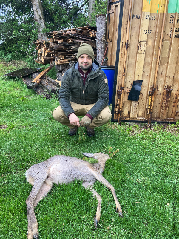 Mint látszik a képen a lövés elég magasan érte a vállapon, sajnos elizgultam a lövést. A másik oldaon viszont elég hátul jött ki, elérte a gyomor elejét, alulbecsültem, hogy mennyire fordult el az ideális irányból. Ennek ellenére nagyon örültem, hogy sikerült lőnöm egy bakot az első május elsejei vadászaton. Ezután elhoztam a kocsit, és elszállítottam a konténerhez az őzet.