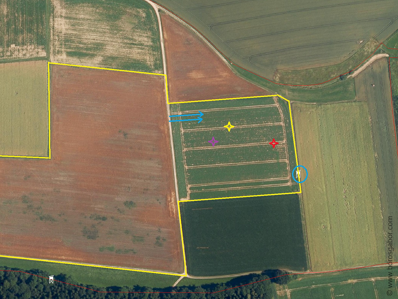 Ezen a napon új tervet készítettünk. G. szokásos délelőtti helyzetfelmérő útja alatt három vaddisznót vélt felfedezni a kukoricában. A terület a júliusból ismert nagy kukoricás. A terv az volt, hogy egy ember felül a Flexi nevű magaslesre, (kék körrel jelöltem a térképen), felszáll a drónnal, megkeresi őket, majd telefonos kapcsolatot létesít a többiekkel, akik hason csúszva odacsúsznak a vaddisznókhoz, és lelövik őket.
